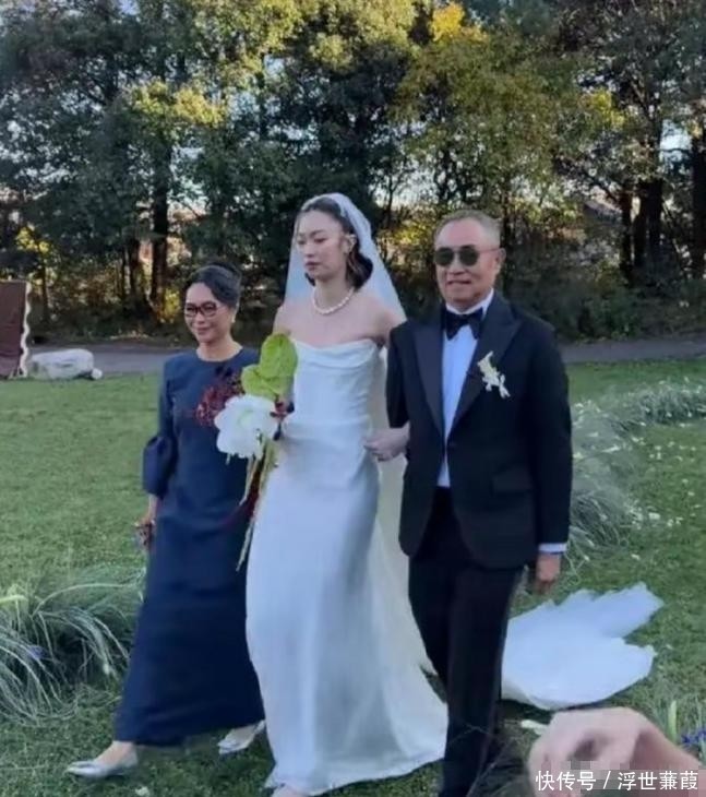 她在父母陪同下,拿着手捧花缓慢入场,得体从容,脖子上的珍珠项链很显眼。