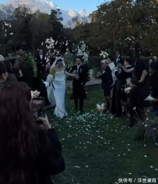 在宾客们的欢呼声中,新郎新娘踩着花瓣走向仪式舞台,场面看起来十分幸福温暖。